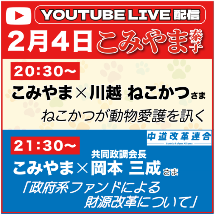 こみやま泰子がYOUTUBEにてLIVE配信を行います。 ぜひご覧ください!! *20:30〜 川越ねこかつ様 -ねこかつが動物愛護を訊く- https://youtube.com/live/1Cy7yIQa4Yg?fe