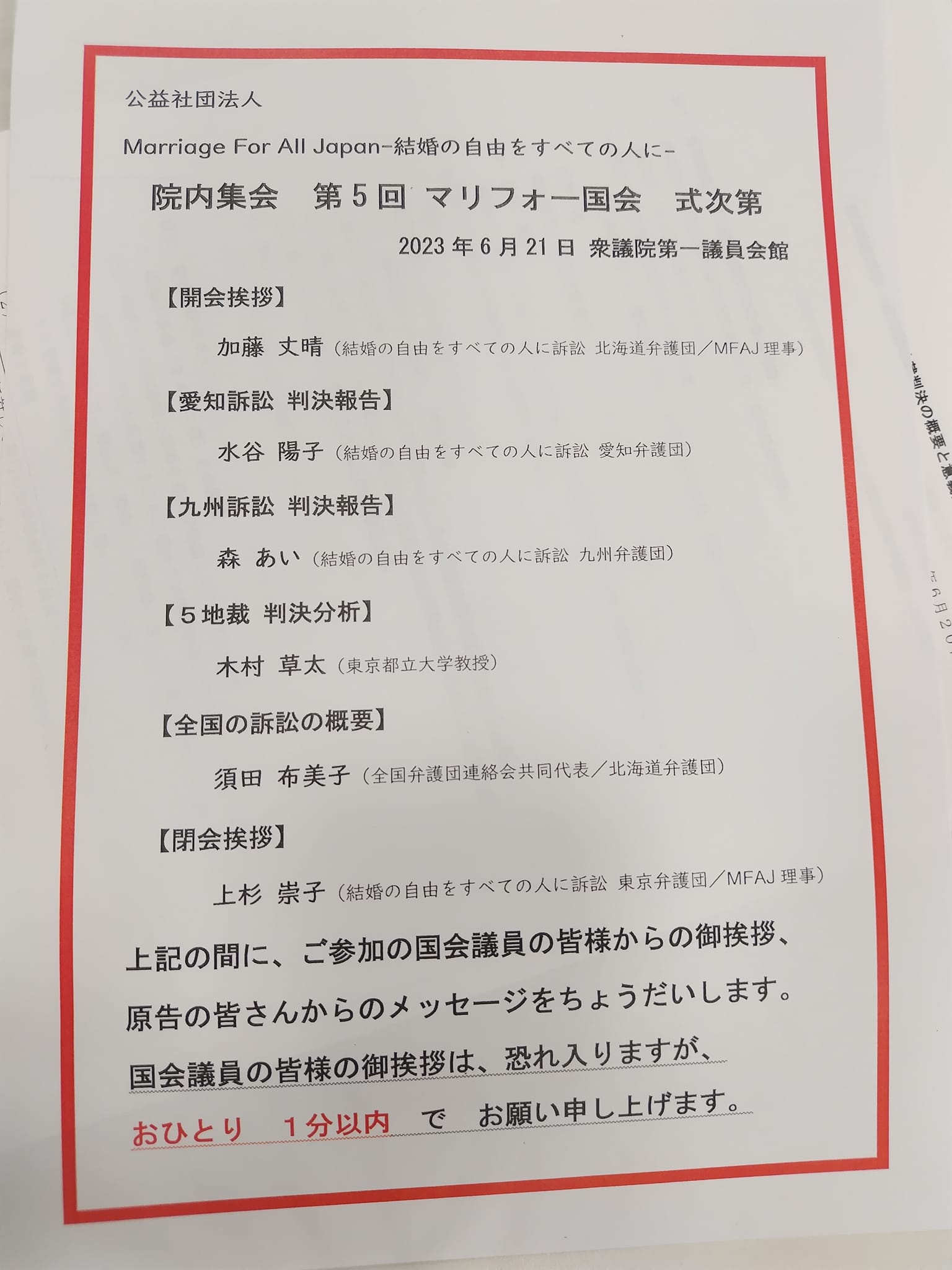 最期の時に“家族“として病院で付き添えないなど、法律婚をしていないことでの不利益についてもマリフォー国会を通じて知りました。活動の記録を記したパンフレットを見ると、法改正や判決を見ること無く、亡くなられた方もいらっしゃること記されています。
