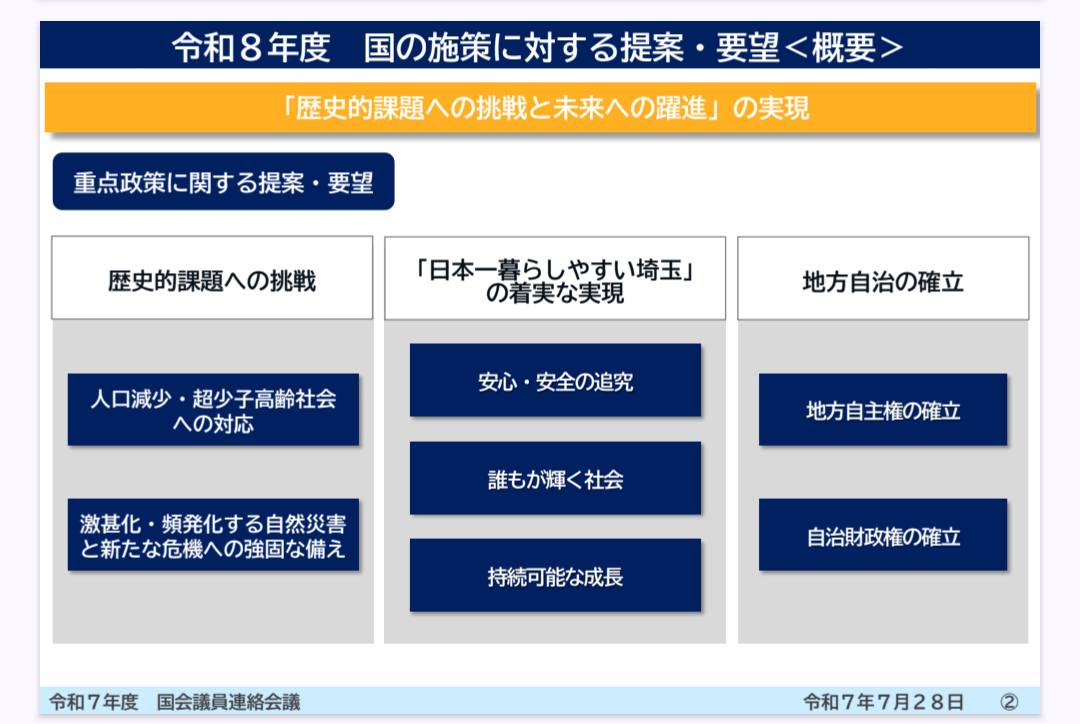 28日、埼玉県選出の衆参国会議員を対象にした、令和7年度国会議員連絡会議が開催されました。 大野元裕知事の説明の後に意見交換。小宮山も出席し、八潮市の道路陥没を発端に、立憲民主党で立ち上げた公共インフラ老朽化・国土強靭化対策PTで国土交通省及び総務省への要請内容が埼玉県の指摘と同様であること、今後は上下水道だけでなく橋梁など公共インフラ老朽化についても検討の必要性を意見してまいりました。