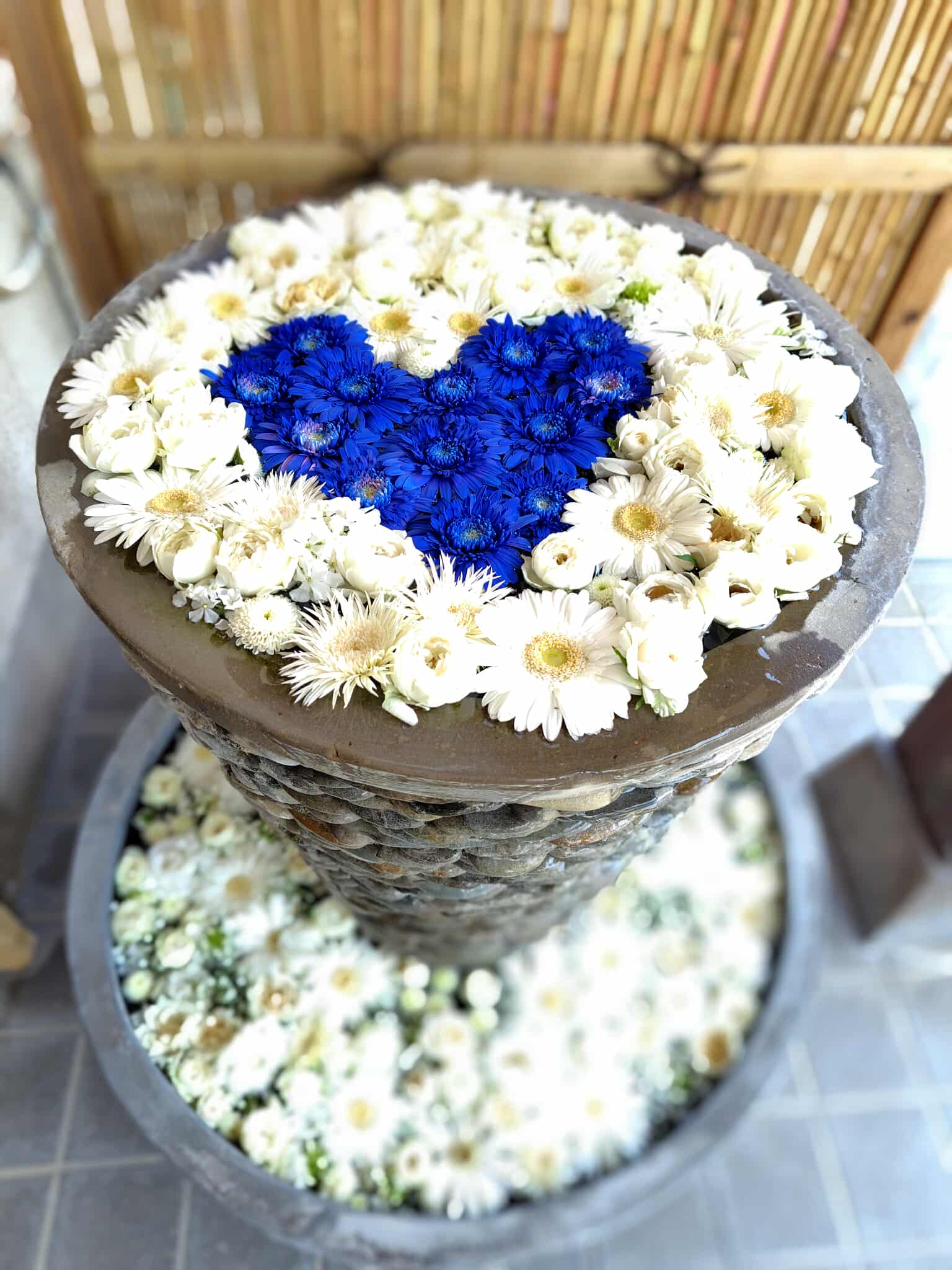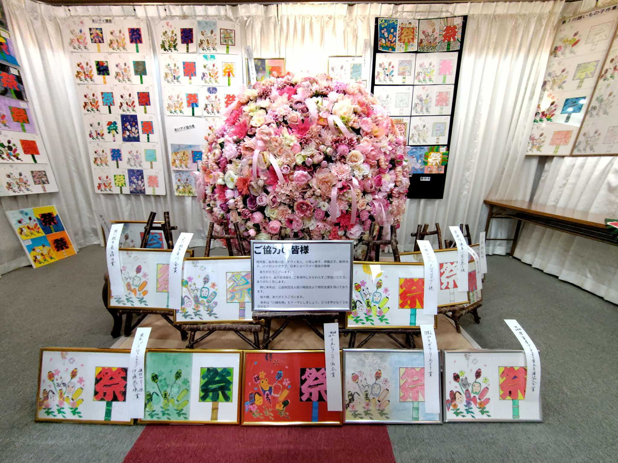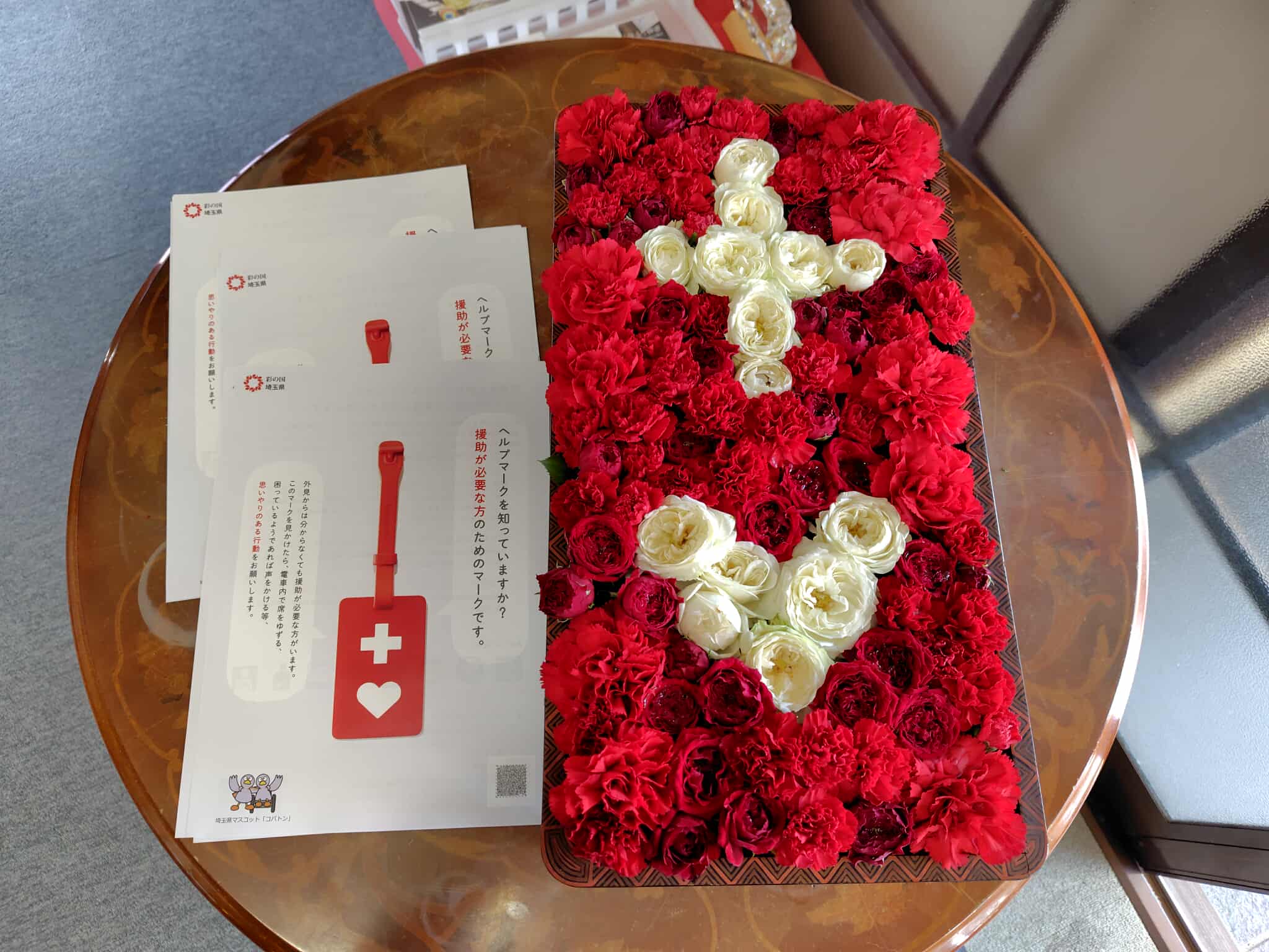 3日、あいアイ美術館「川越みんなのぬり絵」表彰式の開催された最明寺境内には、この日もハートマークやヘルプマークを形どった花飾りが美しくディスプレイされていました。