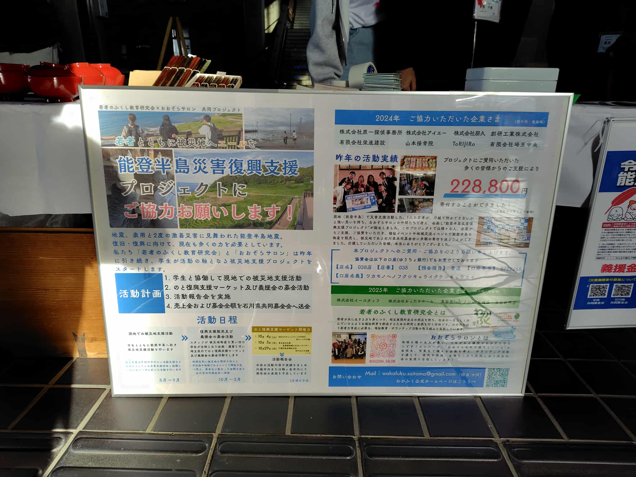 29日開催の川越市社会福祉大会の会場、やまぶき会館の入口前には、昨年、能登半島を襲った震災、豪雨による被害からの復興を支援するおおぞら高校生徒さんたちの活動ブースも、昨年に続き設けられていました。