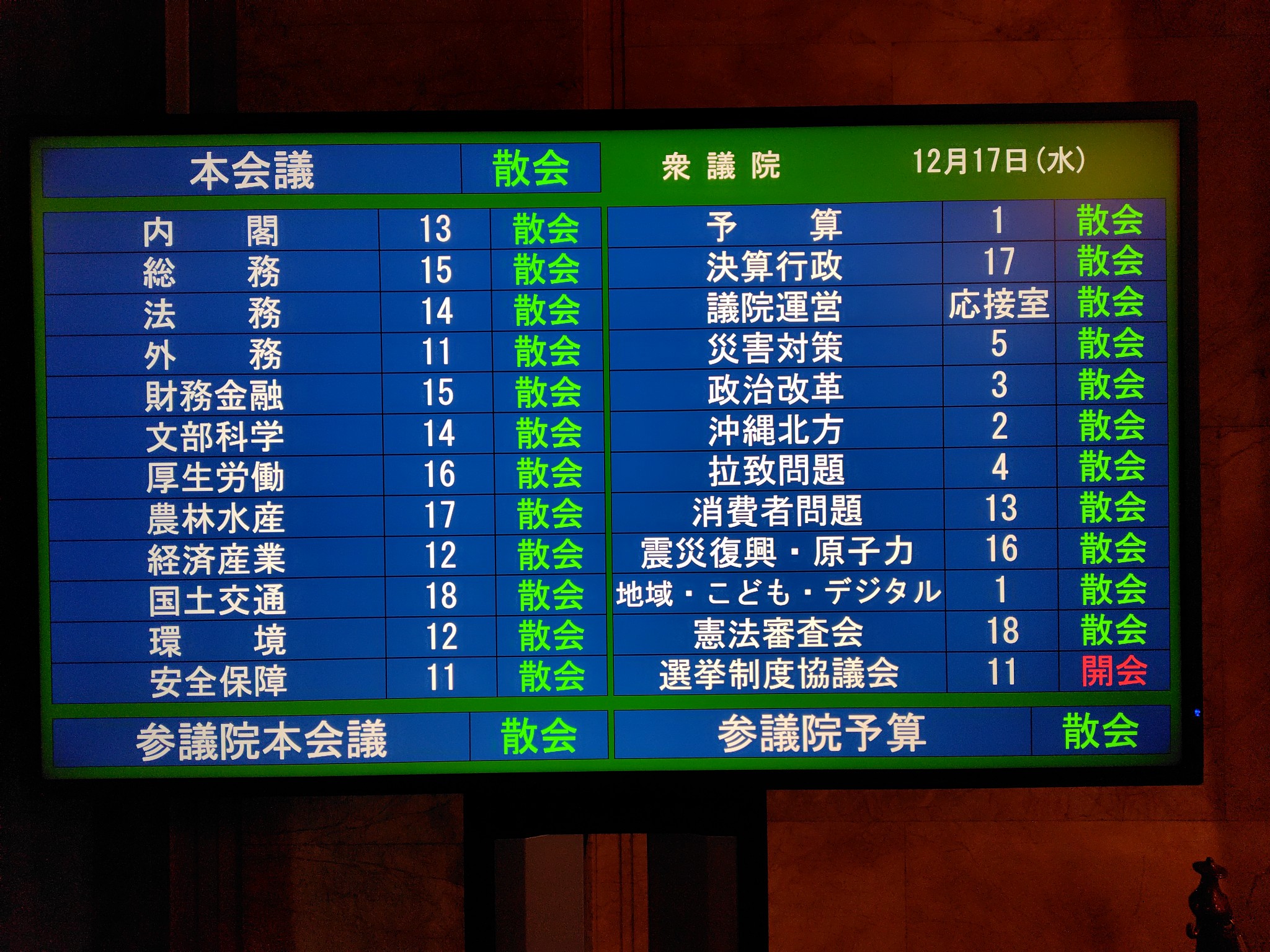 写真は、衆議院本会議散会後に撮影したものですが、選挙制度協議会が開催されていました。
