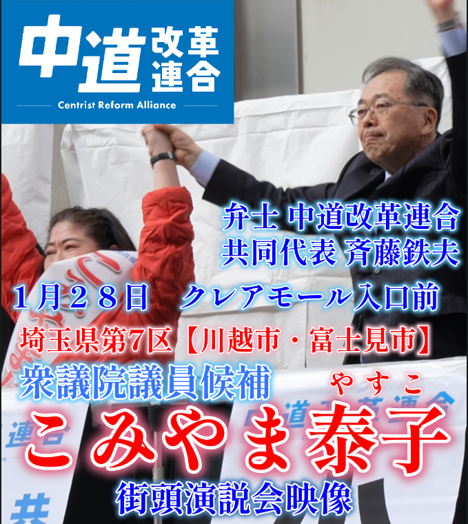 28日、中道改革連合 斉藤鉄夫共同代表によるこみやま泰子への応援演説中、候補者こみやま泰子について語った部分の編集ショート動画をYouTubeにUpしました。 https://youtube.com/shorts/Ifw7SjbZz2Y