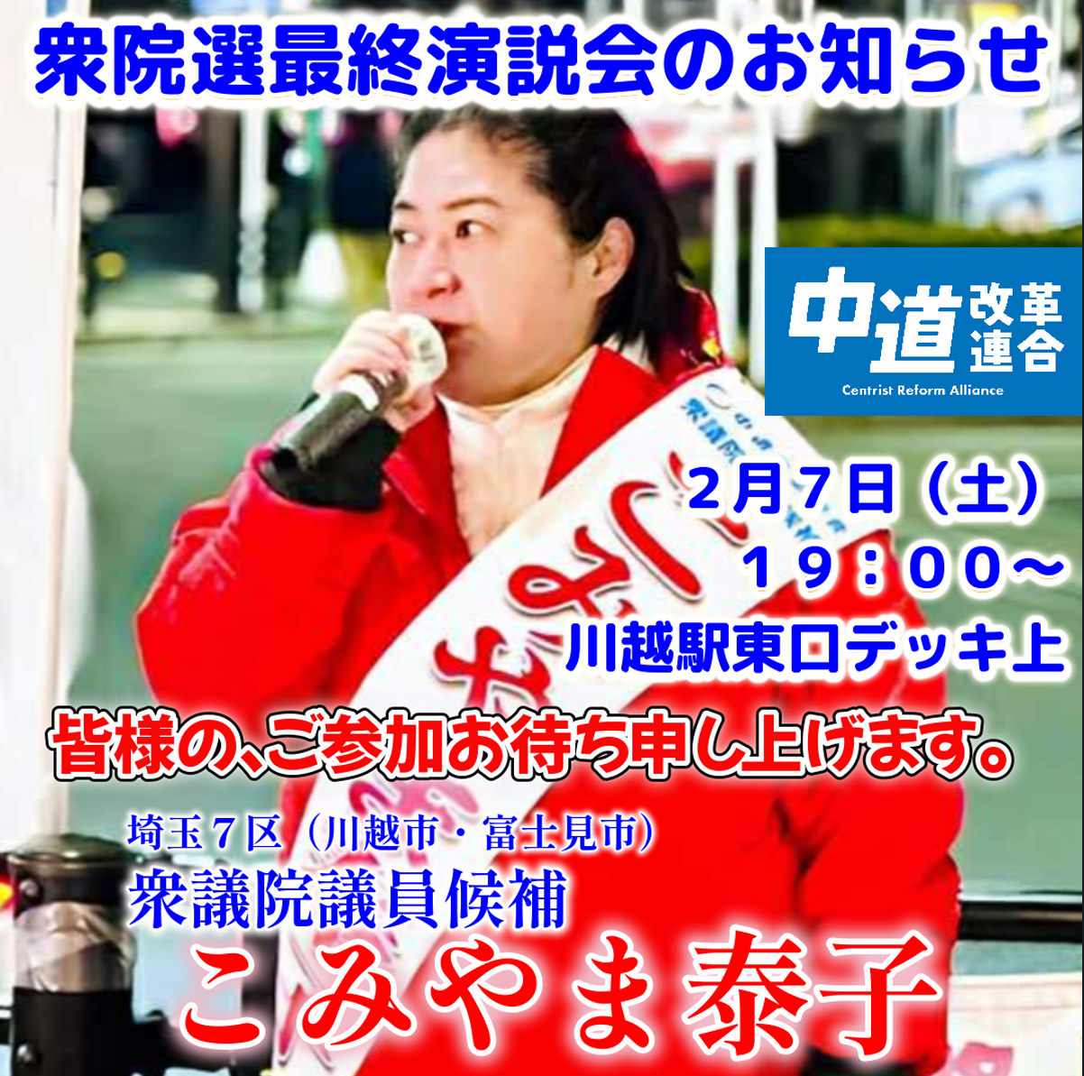 衆議院選挙、最終日2月7日の最終演説会についてご案内申し上げます。