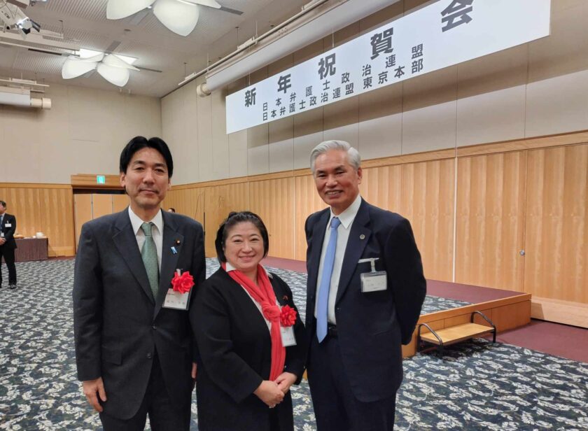 23日、日本弁護士政治連盟(小林元治会長)の皆様の、新年祝賀会が開催され、会場へと伺いました。写真は、小林会長および、私・小宮山と同い年(昭和40年生まれ)の城内実代議士と。