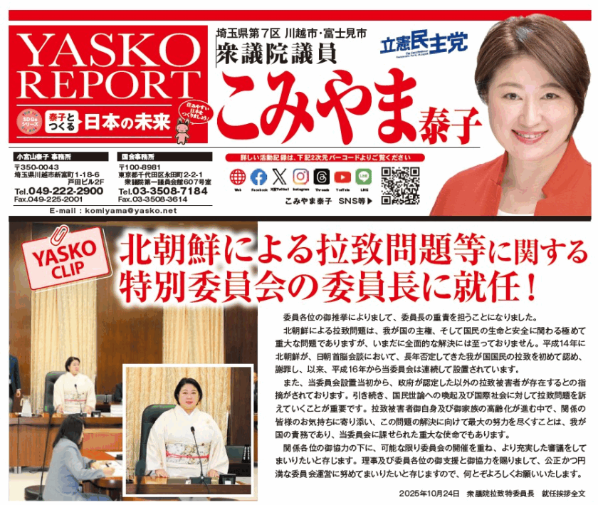 10月27日投開票行われた第50回衆議院総選挙は、自公与党過半数割れ、立憲民主党など野党躍進の結果となり、埼玉7区(川越市・富士見市)で小宮山泰子が小選挙区当選。 米国では、女性大統領の誕生ではなく、トランプ大統領が再び