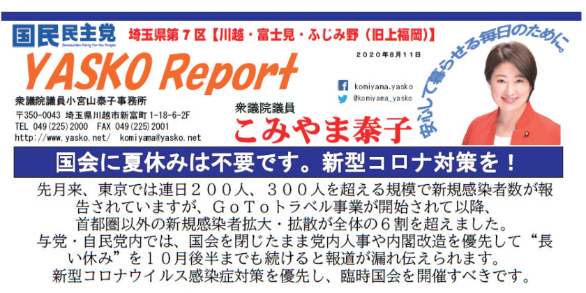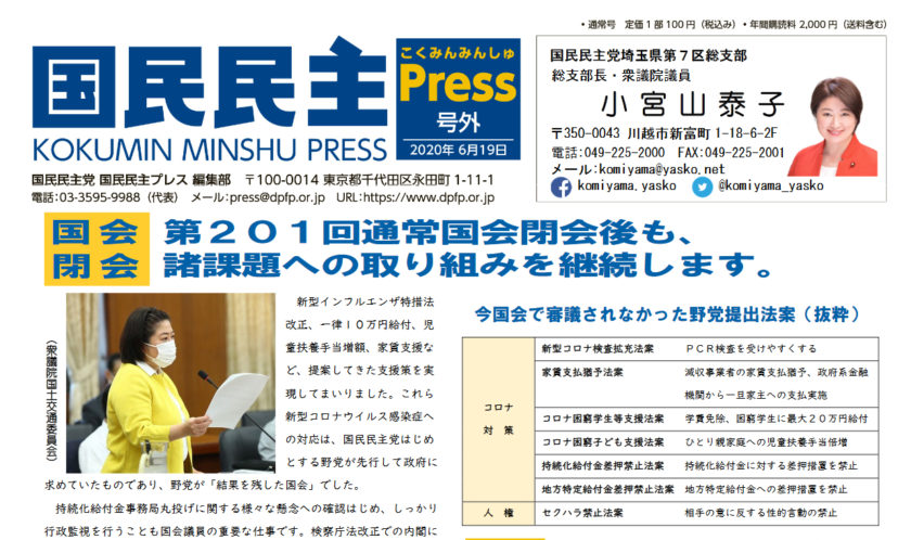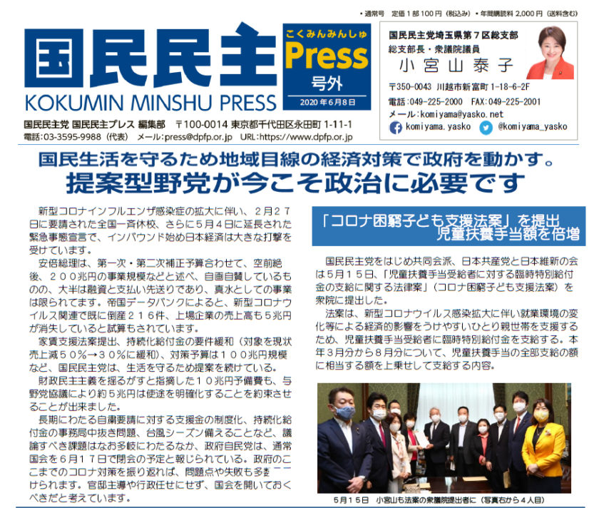 国民民主党の機関紙「国民民主プレス」の号外、埼玉7区版です。 新型コロナウイルス感染症対策の支援相談窓口などについて、まとめた紙面としています。 【国民民主プレス 号外(6月8日 埼玉7区版)pdf】 https://w