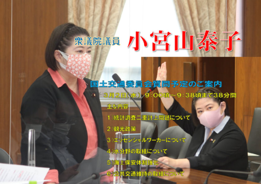 3月2日、衆議院国土交通委員会にて国土交通大臣の所信に対する質疑が行われ質問機会をいただくこととなりました。 《 国土交通委員会 》 【期日】 2022年3月2日(水) 【時間】 9:00頃~9:38頃まで38分間 【主