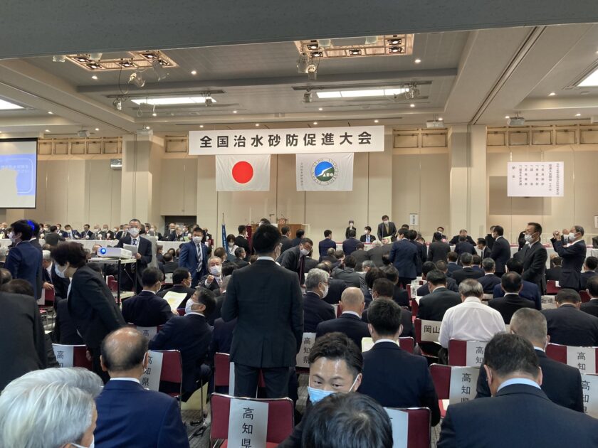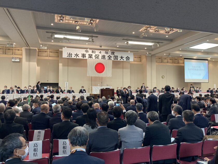 4月21日、砂防会館にて、全国水防管理団体連合会主催、令和4年度「全国水防大会」が開催されました。写真は、衆議院本会議開催と日程重なっていたため、事務所スタッフが撮影。 終了後、大会での要望書決議文を愛媛県八幡浜市の大城