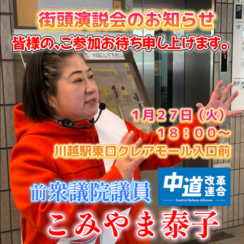 以下の通りに、街頭演説会を開催いたします。 多くの皆様のご参加、お待ち申し上げます。 日時 2026年1月27日(火)18:00~ 場所 川越駅東口クレアモール入口前