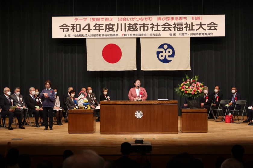 11日、令和4年度川越社会福祉大会が3年振りにリアル開催され、来賓として出席し祝辞を述べました。 祝辞では、表彰を受けられた皆様はじめ、社会福祉に寄与されている方々が、このコロナ禍でも配慮が必要な方々と接し、地域やご家庭
