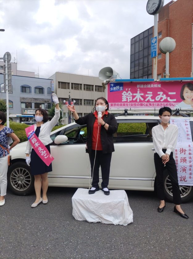 27日、西武新宿線久米川駅南口前にて、立憲民主党公認都議会議員候補、鈴木えみこさんの街頭演説会。蓮舫代表代行も応援入り。新人の鈴木えみこさんは、元日本航空国際線キャビンアテンダント。退職後、幼児教室の運営を行っていらっし