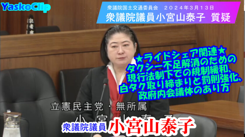 2024年3月13日の衆議院国土交通委員会質疑、ライドシェアが4月から一部導入となりますが、タクシー不足の状況および不足解消に向けた現行法制下での対応、白タク取り締まりと罰則強化の必要性、政府内会議の在り方について取り上