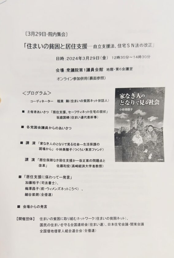 29日、「住まいの貧困と居住支援―自立支援法、住宅SN法の改正」院内集会会場にて挨拶。今国会、厚生労働委員会で生活困窮車支援法改正案、国土交通委員会では住宅セーフティネット法改正案と、住宅支援に関する法改正がある。不充分