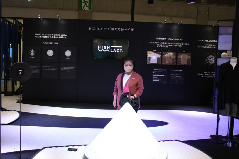 7日、東京ビックサイト内、“捨ててもいい服”という大胆なコピーとともに展示されていた衣装素材展示。 新しい素材開発、利用拡大も続いています。 新素材開発にも注目
